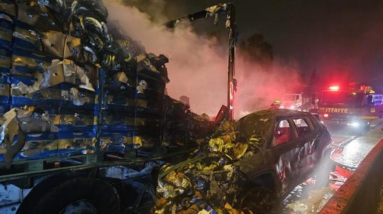 Kaza, gece yarısı merkez Sarıçam ilçesi Tarsus- Adana- Gaziantep (TAG) Otoyolu Yıldırım Beyazıt Mahallesi yakınlarında meydana geldi. Mustafa E. idaresindeki 01 VY 001 plakalı araba, teze nazaran evvel Abdulkadir C. idaresindeki 06 CYY 572 plakalı cipe, akabinde da Latif S.’nin kullandığı 27 R 4014 plakalı muz yüklü TIR’a çarptı. Zincirleme kazada TIR’ın dorsesinin altında sıkışan araba, yanmaya başladı. Kazadan yara almadan kurtulan başka şoförler ve etraftakiler, yanmaya başlayan arabadaki Mustafa E. ve yanındaki Hatice Ç.’yi araçtan hafif yaralı olarak çıkardı. Alevler süratle araba ve muz yüklü dorseyi sararken, bölgeye itfaiye, sıhhat ve jandarma takımları sevk edildi. Kazadan yaralı olarak kurtulan Mustafa E. ve Hatice Ç., sıhhat takımlarınca hastaneye kaldırıldı. Araba ve TIR’ın dorsesini saran yangın, itfaiye takımlarının yarım saatlik müdahalesi sonucu söndürüldü. Yangında araba büsbütün yanarak demir yığınına dönerken, TIR’ın dorsesi de kullanılmaz hale geldi.