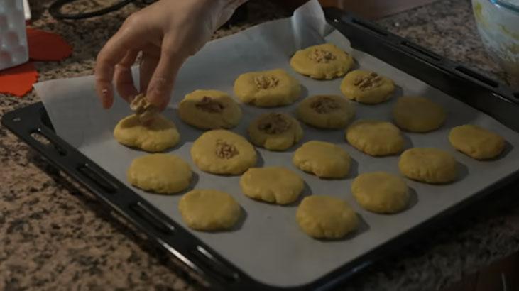 Dilimlenen modüllerin ortasına bir çubuk yahut kaşığın sapıyla yavaşça bastırarak yaprak gibisi bir hal oluşturun. Akabinde yağlı kağıt serilmiş bir fırın tepsisine, birbirine değmeyecek formda yerleştirin. Ayrılan yumurta sarısını bir fırça yardımıyla kurabiyelerin üzerine sürün.