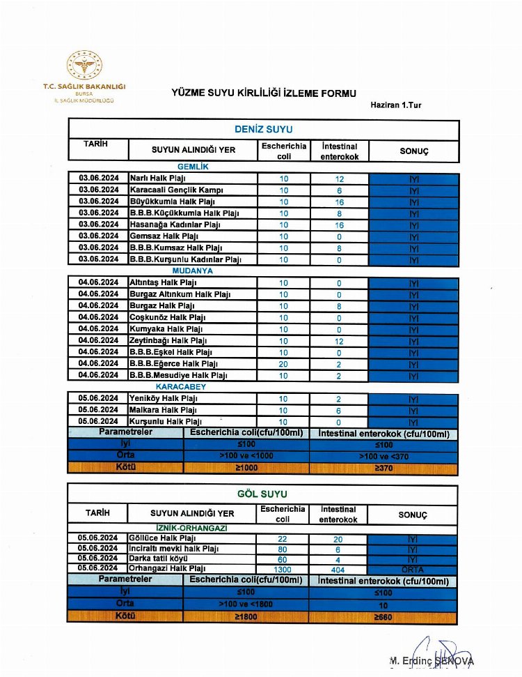 Bursa İl Sağlık Müdürlüğü yaz sezonunda üç ay boyunca iki tur olarak yaptığı deniz suyu ölçümlerinde Haziran ayının ilk tur ölçüm verilerini kamuoyuyla paylaştı.