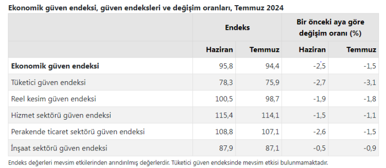 Bir önceki aya göre Temmuz ayında tüketici güven endeksi yüzde 3,1 oranında azalarak 75,9 değerini, reel kesim (imalat sanayi) güven endeksi yüzde 1,8 oranında azalarak 98,7 değerini, hizmet sektörü güven endeksi yüzde 1,1 oranında azalarak 114,1 değerini, perakende ticaret sektörü güven endeksi yüzde 1,5 oranında azalarak 107,1 değerini, inşaat sektörü güven endeksi yüzde 0,9 oranında azalarak 87,1 değerini aldı.