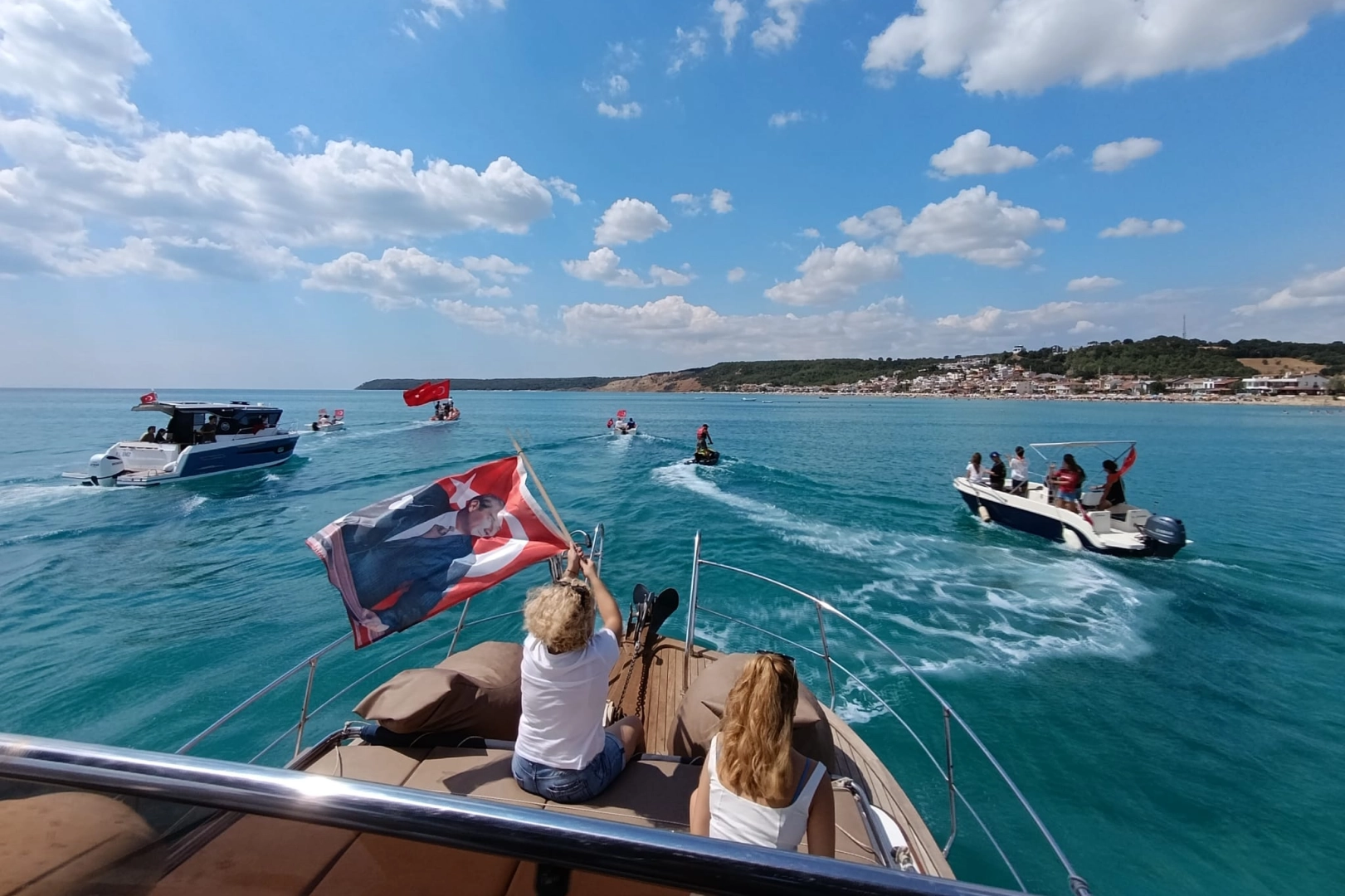 Erdoğan DEMİR / EDİRNE (İGFA) – Saat 13.30’da Vali Konağı önünde geçen tekneler, sahilde toplanan vatandaşlar tarafından ellerindeki bayraklarla selamlanarak 30 Ağustos Zafer Bayramı’nın coşkusu yaşatıldı.