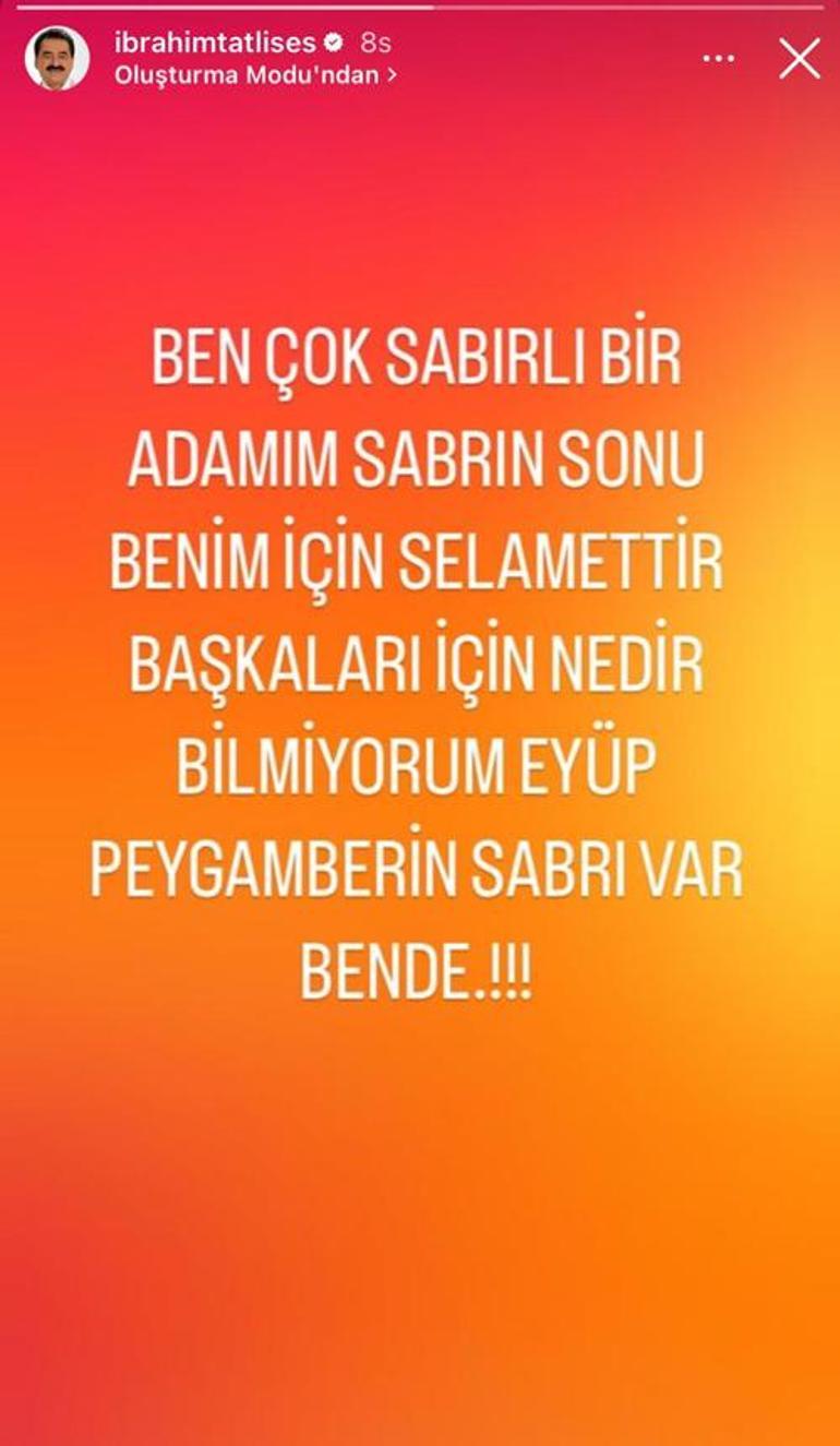 Daha evvel de sabır iletisi paylaşan İbrahim Tatlıses bir sefer daha imalı paylaşımda bulundu. Instagram hesabından paylaşım yapan Tatlıses, “Ben çok sabırlı bir adamım, sabrın sonu benim için selamettir. Öbürleri için nedir bilmiyorum Eyüp peygamberin sabrı var bende!” dedi.