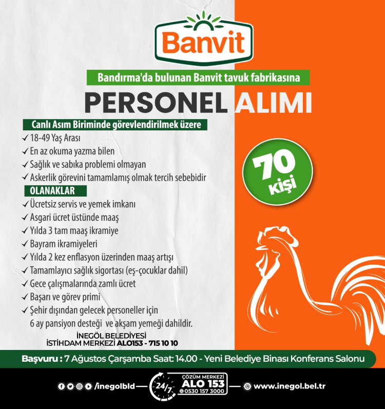 “Banvit firması personel alımı için başvurular 07 Ağustos Çarşamba günü 14.00’da İnegöl Belediyesi Yeni Hizmet Binası zemin katındaki çok amaçlı salonda alınacak. Yapılacak alımla ilgili detaylı bilgi almak isteyen vatandaşlar 153 hatları üzerinden ve 0 224 715 10 10 Nolu telefondan İnegöl Belediyesi İstihdam Merkezine ulaşabi