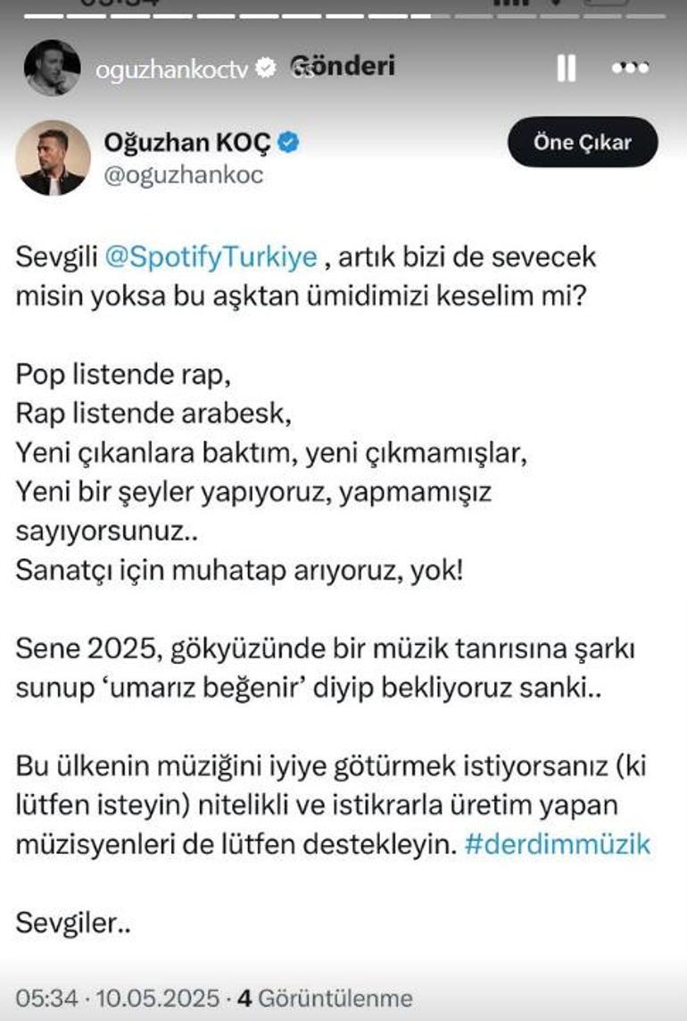 Oğuzhan Koç da toplumsal medya hesabından bahse ait yaptığı paylaşımda, “Sevgili Spotify Türkiye, artık bizi de sevecek misin yoksa bu aşktan ümidimizi keselim mi? Pop listende rap, rap listende arabesk, yeni çıkanlara baktım, yeni çıkmamışlar, yeni bir şeyler yapıyoruz, yapmamışız sayıyorsunuz. Sanatçı için muhatap arıyoruz, yok. Sene 2025, gökyüzünde bir müzik yaradanına müzik sunup ‘umarız beğenir’ deyip bekliyoruz güya. Bu ülkenin müziğini güzele götürmek istiyorsanız (ki lütfen isteyin) nitelikli ve istikrarla üretim yapan müzisyenleri de lütfen destekleyin.” dedi.