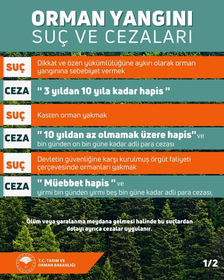 Dikkat ve özen yükümlülüğüne aykırı olarak orman yangınına sebebiyet vermenin ‘suç’ olduğu belirtildiği inografik tabloda, bu suçun 3 yıldan 10 yıla kadar hapis cezası olduğu, kasten orman yakmak suçunun ise 10 yıldan az olmamak üzere hapis ve bin günden 10 bin güne kadar adli para cezası olduğu kaydedildi.
