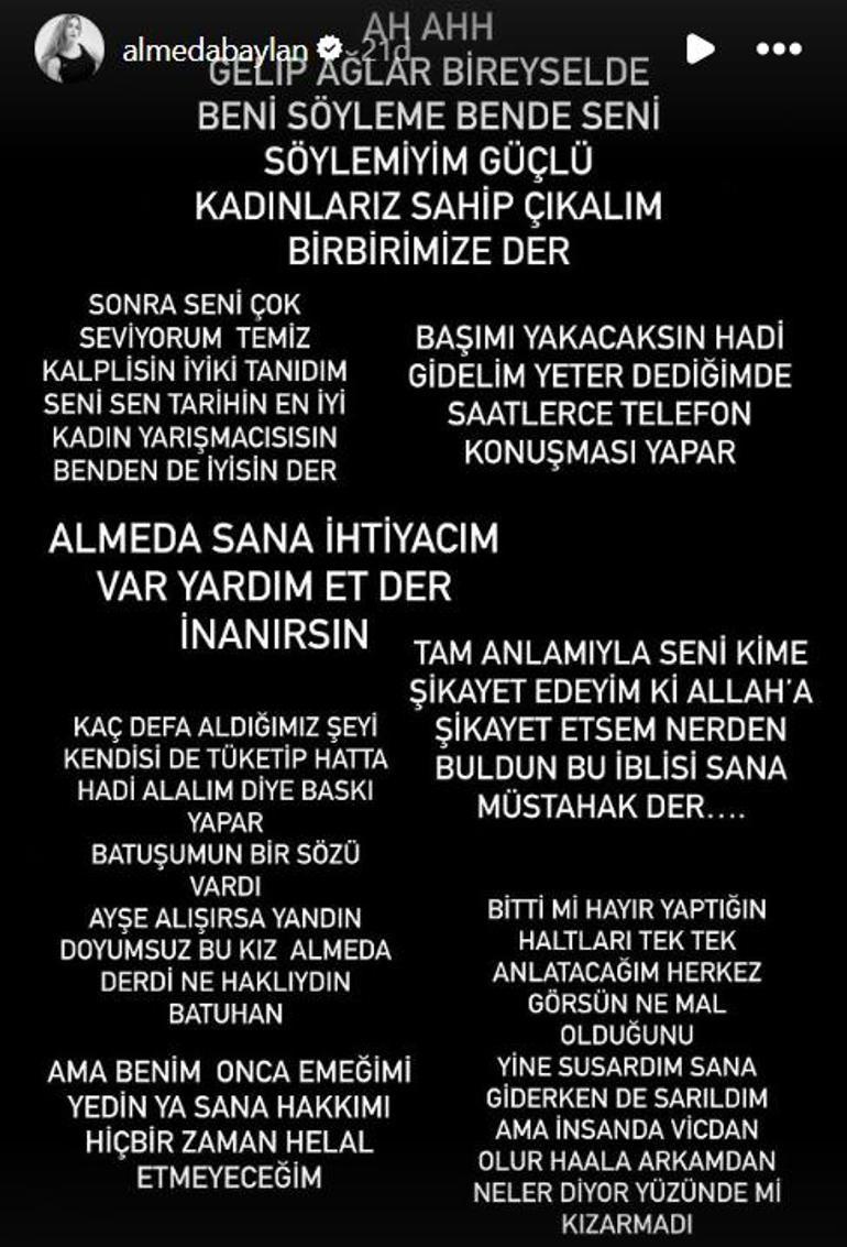 Bir paylaşım daha yapan Almeda, “Ayşe sen benim en büyük pişmanlığımsın” dedi.
